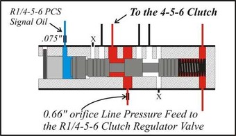 With the exception of the Low and Reverse Clutch, each clutch inside this transmission is operated by a solenoid through its respective regulating valve. With Gen 1-based models, a relatively small feed orifice was located on the line pressure supply side of the 4-5-6 Clutch Regulating Valve. With this orifice on one side of the valve and the wave plate on the opposite side of the valve, it stabilized the valve from having a pressure spike when it moved from a full feed position to regulation. When the cushion (wave) plate was removed to add an additional friction plate for increased torque capacity, this orifice was moved to the clutch pressure supply side of the valve. This was done to have a greater control of the apply of the clutch to prevent a harsh engagement with the absence of a cushion plate.