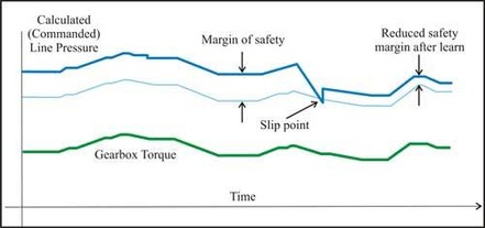 | One software change that took place is related to fuel economy, which affects how the TEHCM controls line pressure inside the transmission. Typically, once a shift transition is made, line pressure is increased and held so as to keep the driving or holding clutch from slipping, maintaining the commanded gear. The engine then drives the pump through the torque converter. When line pressure becomes high, this places an additional mechanical load on the engine, negatively affecting fuel economy. For Gen 2, a “system pressure learn” program was written where the computer will periodically bring line pressure down until it sees it slip. It will then raise line pressure just slightly above the slip point, minimizing the margin of safety between slip and non-slip conditions. By doing this, the engine is driving a pump at lower pressures for longer periods of time. This places less load on the engine and thus increases fuel economy. |