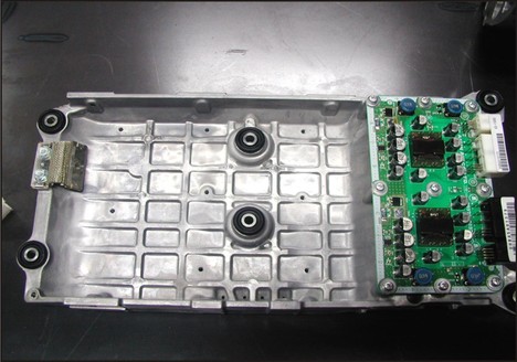 Once the inverter has been removed this cast aluminum cover is next. All the bolts are mounted in rubber grommets, make certain during assembly they are all in place.