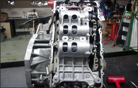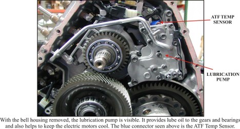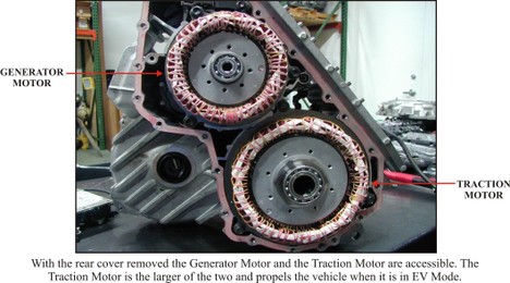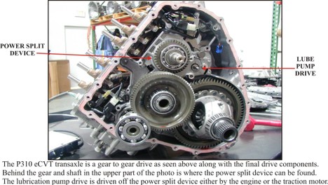 The P310 eCVT transaxle is a massive unit weighing in at 287 pounds. It uses a damper plate assembly instead of a torque converter between the transaxle and the engine.