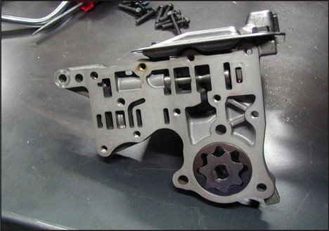 The lubrication pump is a simple gerotor style, with a pressure regulating valve. The sump filter is bolted to the pump and is readily available.