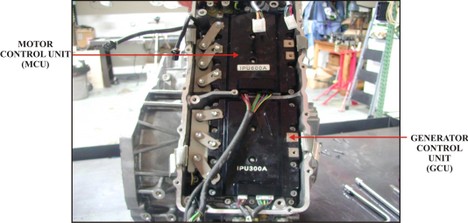 Underneath the capacitor pack is where the Generator Control Unit (GCU) is located. It is rated at 300 Amps. Next to the GCU is the Motor Control Unit (MCU). It is rated at 600 Amps. These two modules control the operation of the Generator Motor and the Traction Motor which is the larger of the two.