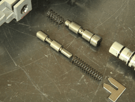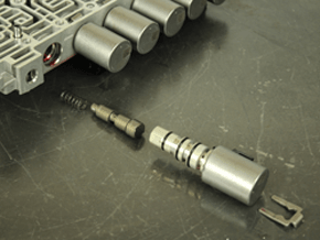 | Beginning with the solenoids, there are a total of nine on the valve body, as seen in Figure 8. There is an assigned letter in the casting for each of the solenoids, as seen in Figures 2 and 3. Here is where some confusion may occur, as the solenoids are primarily referred to by their function and by a number, not their letter. |