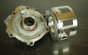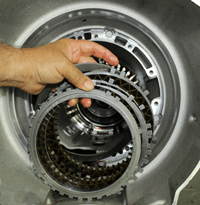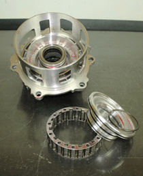 | The 1-2-3-4-5-Reverse clutch pack happens to be the last set of clutches inside the transmission. The application and release of this clutch pack is controlled by an apply piston and a clutch piston dam. These two pistons are mounted in a case extension as seen in Figure 8. Figure 9 shows the clutch piston dam assembly out of the case extension. This piston has three rubber D-rings to inspect. Figure 10 shows the clutch apply piston off of the case extension. This clutch apply piston has two rubber D-rings to inspect; one on the piston and one on the case extension. |